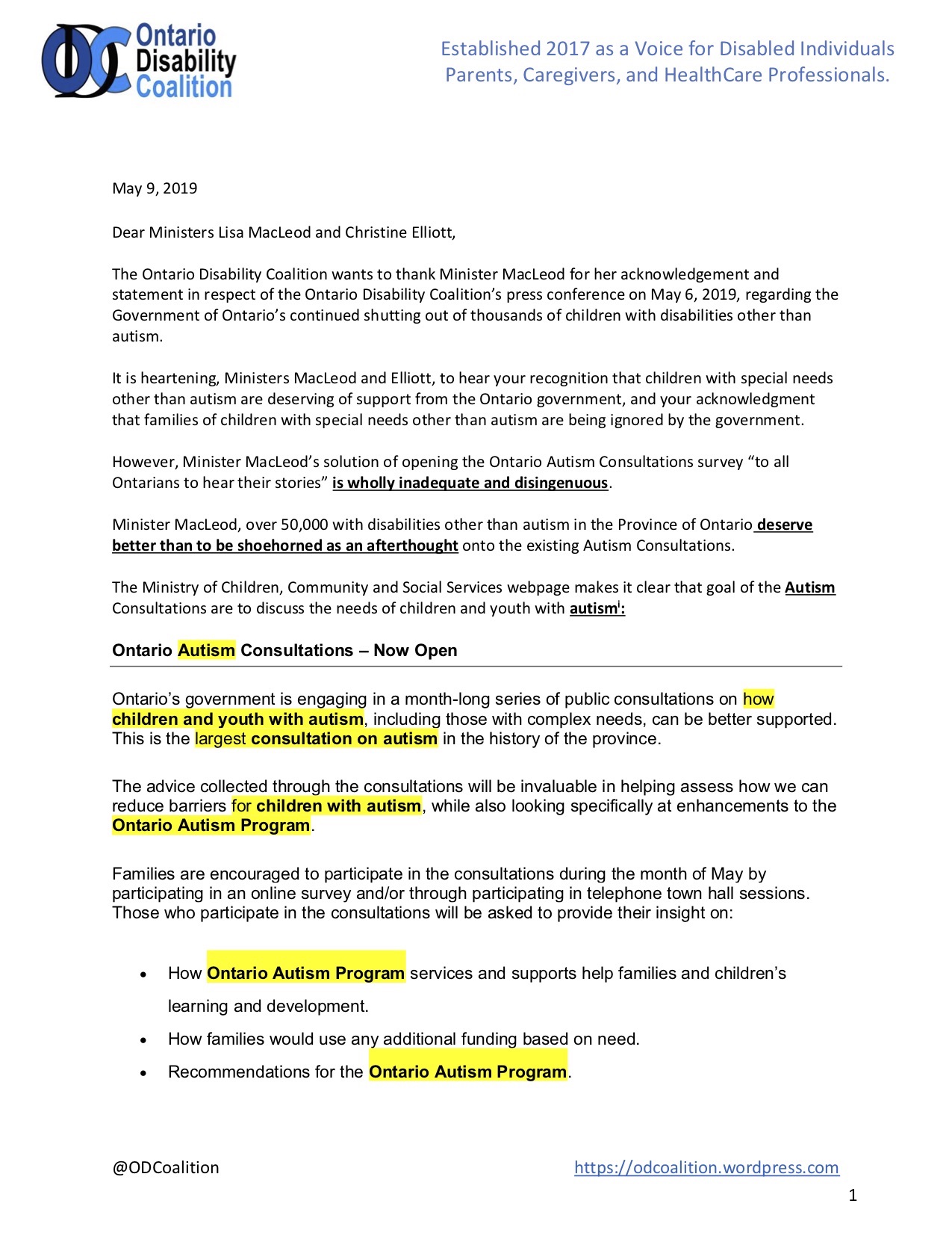 Today, the Ontario Disability Coalition sent a response back to Ministers MacLeod and Christine Elliott, to express our concern and frustration at the government’s continued dismissal of the needs of thousands of children with disabilities in Ontario: