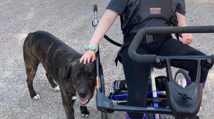 Picture: Jessica smiling on a sunny day outdoors on her bright blue adapted bike petting her brown and black dog.