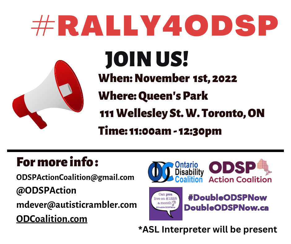 People with disability are living in legislated sub poverty in Ontario. This is a violation of their human rights and pushing many to seek out Medical Assistance in Dying (MAiD), these rates combined with inflation are pushing people with disabilities to homelessness or on the edge homelessness. Please join us at Queens Park November 1st @ 11:00 am to call on the Ontario Government, the Premier and Minister of Community and Social Services to take immediate action. Ensure everyone has a roof over their heads, food on the table and can live a life with dignity.