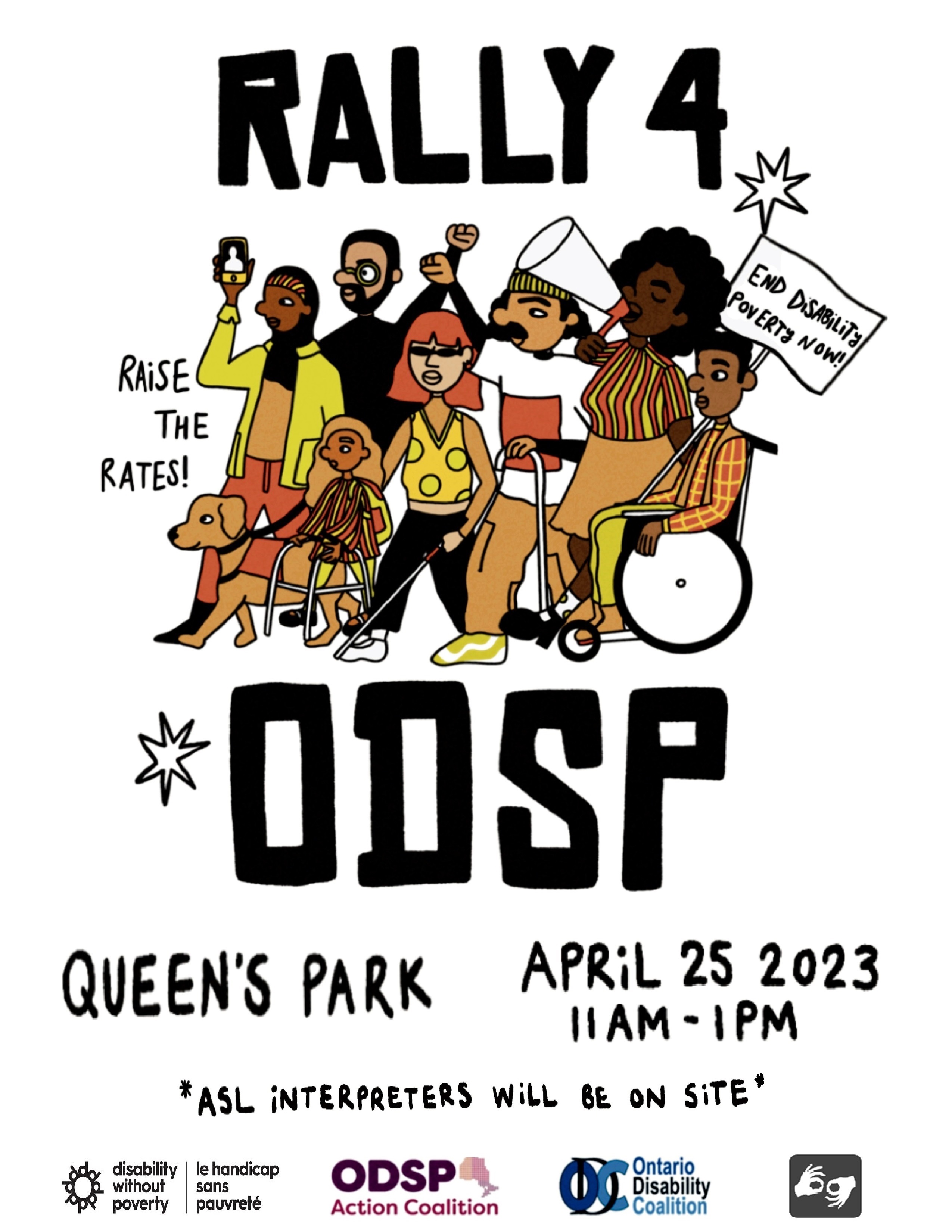 Image Description: The background is white with a colourful illustration of seven people and a service dog marching in protest with signs that read “Raise the Rates!” And “End Disability Poverty Now!”. The text reads, “Rally 4 ODSP. Queen’s Park. April 25, 2023, 11AM – 1PM”. And “ASL interpreters will be on-site” At the bottom are the logos of Disability without Poverty, ODSP Action Coalition and Ontario Disability Coalition.